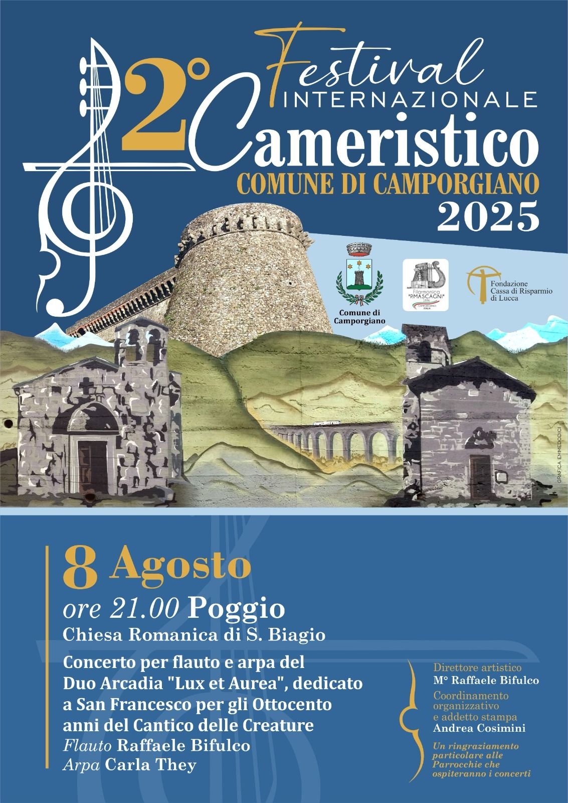 Venerdì 8 agosto spetterà alla Chiesa romanica di San Biagio, nella frazione di Poggio, farsi cornice del concerto per flauto (Raffaele Bifulco) e arpa (Carla They) del Duo Arcadia “Lux et Aurea” dedicato a San Francesco per gli 800 anni del Cantico delle Creature.
