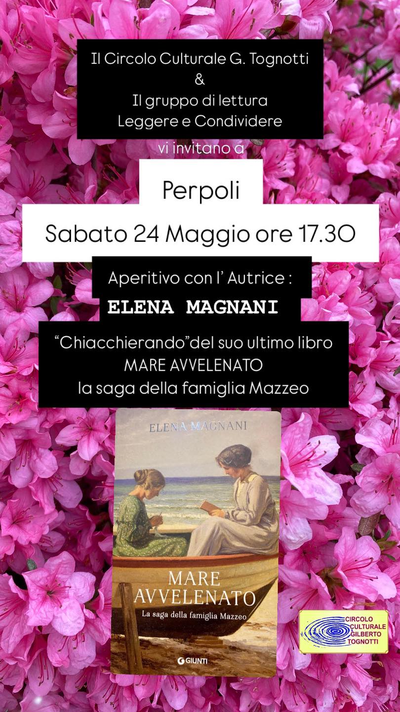 Alle ore 17.30 il Circolo Culturale G. Tognotti e il gruppo di lettura di Gallicano Leggere e Condividere vi aspettano per “ chiacchierare “ con ELENA MAGNANI autrice anche del libro “ La Segnatrice” , del suo ultimo Romanzo MARE AVVELENATO e non solo..