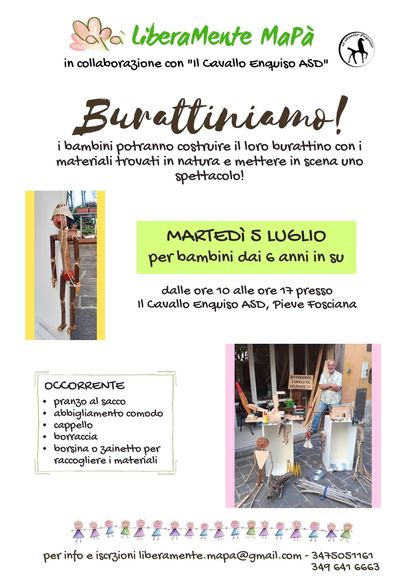 Home Eventi BurattiniamoBurattiniamoDalle ore 10 alle 17.00 presso Il Cavallo Enquiso laboratorio “Burattiniamo” per bambini dai 6 anni in suPer info e prenotazioni: email liberamente.mapa@gmail.com – +39 347 5051161 Scarica la locandina + Aggiungi a Google Calendar + Esporta iCal Data05 Lug 2022 Expired! Ora ? Inizio Evento: 10.0 AM Fine Evento: 5.0 PM Luogo Pieve Fosciana Condividi questo evento