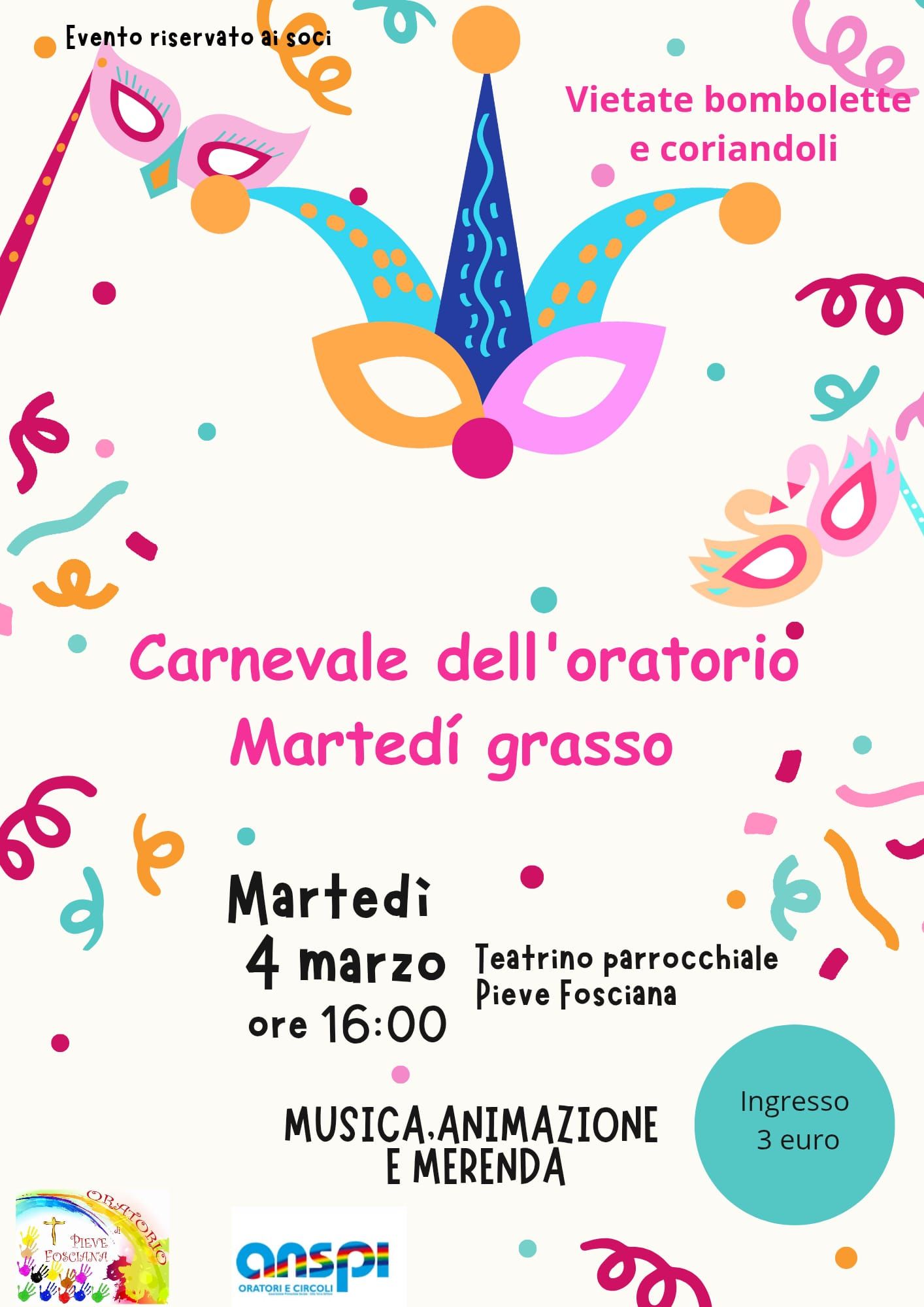 Dalle ore 16.00 al teatrino arrocchiale Carnevale all’oratorio con musica, animazione e merenda