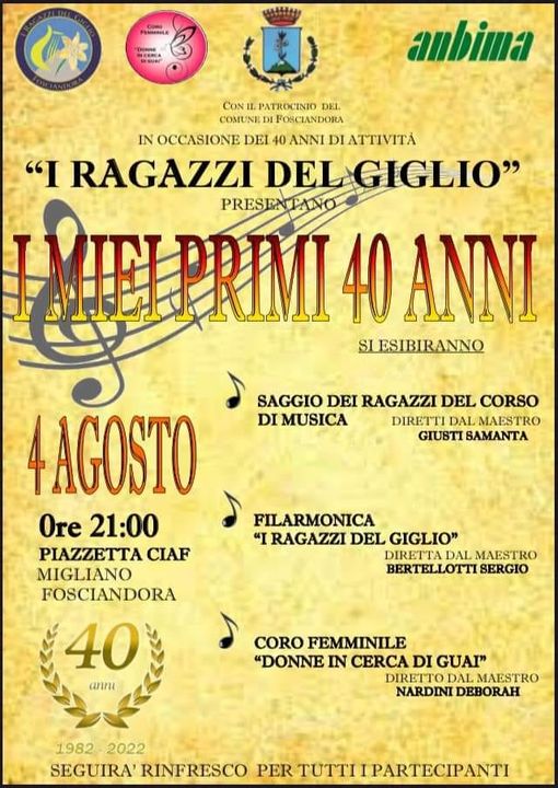 Alle ore 21.00 presso la piazzetta CIAF si terrà il concerto dal titolo “I miei primi 40 anni” de “I Ragazzi del giglio” in occasione dei 40 anni di attività