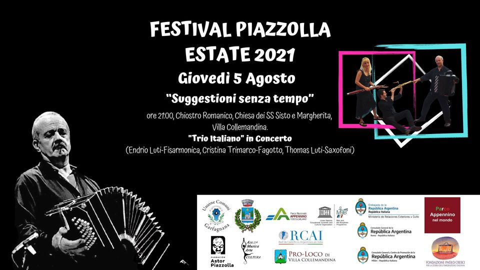 Alle ore 21.00, nell’ambito del Festivla Piazzolla, presso il chiostro romanico della Chiesa di San Sisto e Santa Margherita concerto “Suggestioni senza tempo” del Trio Italiano composto da a Endrio Luti (fisarmonica), Cristina Trimarco (fagotto) e Thomas Luti (saxofoni).