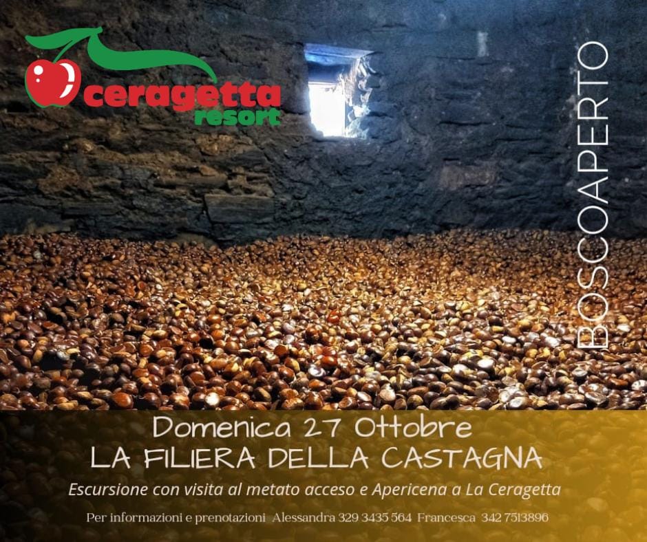 Una giornata alla scoperta del ciclo della castagna, dalla raccolta nelle selve all’ assaggio della farina a km zero. Partiremo dalla Ceragetta verso Capanne di Careggine, dove ci attenderà Giorgio per spiegarci tutti i segreti della lunga lavorazione delle castagne con la visita al metato, dove le castagne raccolte stanno seccando e tra qualche settimana saranno pronte da portare al mulino per essere trasformate in dolce Farina di Neccio DOP della Garfagnana, la stessa che potremo degustare presso il Ristorante La Ceragetta. Da qui saliremo attraverso il castagneto verso il suggestivo intaglio nella roccia alle pendici del Monte Sumbra, dove pranzeremo al sacco, per poi riscendere lungo lo stesso percorso. Al ritorno, col permesso dei proprietari, ci fermeremo per raccogliere un po’ di castagne da portare a casa, e infine rientreremo a La Ceragetta, dove ci aspettano per deliziarci con una ricca apericena a base di prodotti tipici : affettati e formaggi locali con pasta fritta, miele e marmellate, crostini caldi e freddi, verdure in agrodolce, fagioli giallorini e necci con ricotta.