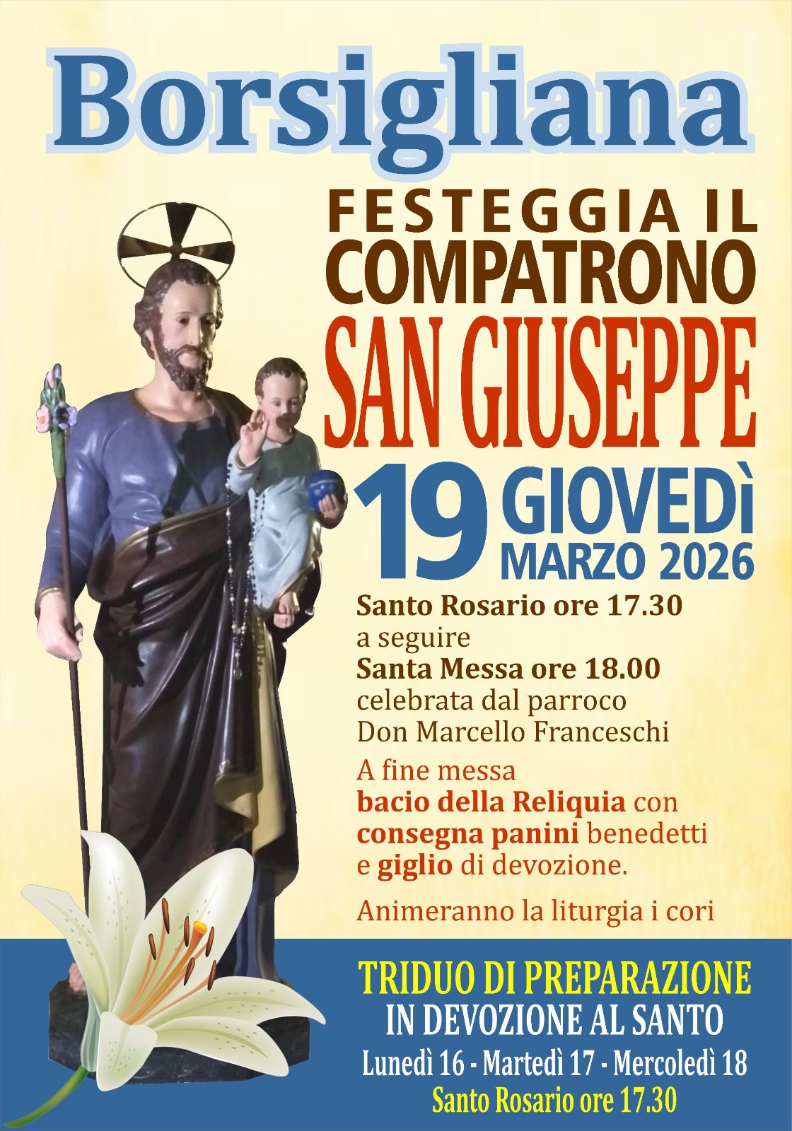 Home Eventi Festa del Patrono San GiuseppeFesta del Patrono San GiuseppeDalle ore 17.30 festeggiamenti del patrono San Giuseppe Scarica la locandina + Aggiungi a Google Calendar + Esporta iCal Data19 Mar 2026 Expired! Ora ? Inizio Evento: 5.30 PM Fine Evento: 7.0 PM Luogo BorsiglianaPiazza al Serchio Condividi questo evento