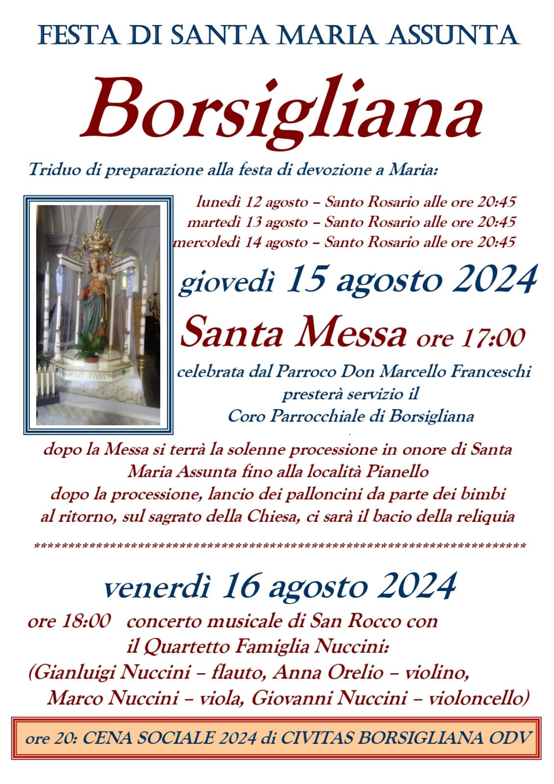Nella giornata di ferragosto Borsigliana festeggia la Madonna Assunta in Cielo, patrona del paese, con cerimonie religiose e musica