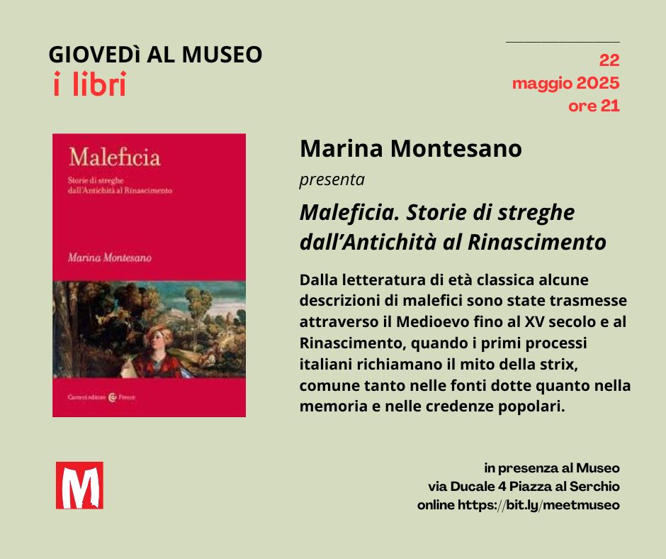 Le streghe sono le protagoniste dell’appuntamento di questa sera alle ore 21.00, con la presentazione del volume Maleficia. Storie di streghe dall’Antichità al Rinascimento (Carrocci Editore, 2023), ospite la Professoressa Marina Montesano. È possibile assistere all’incontro sia in presenza, presso la sede del Museo, in Via Ducale 4 a San Michele, che online, prenotandosi al link: https://bit.ly/maggiomuseo25