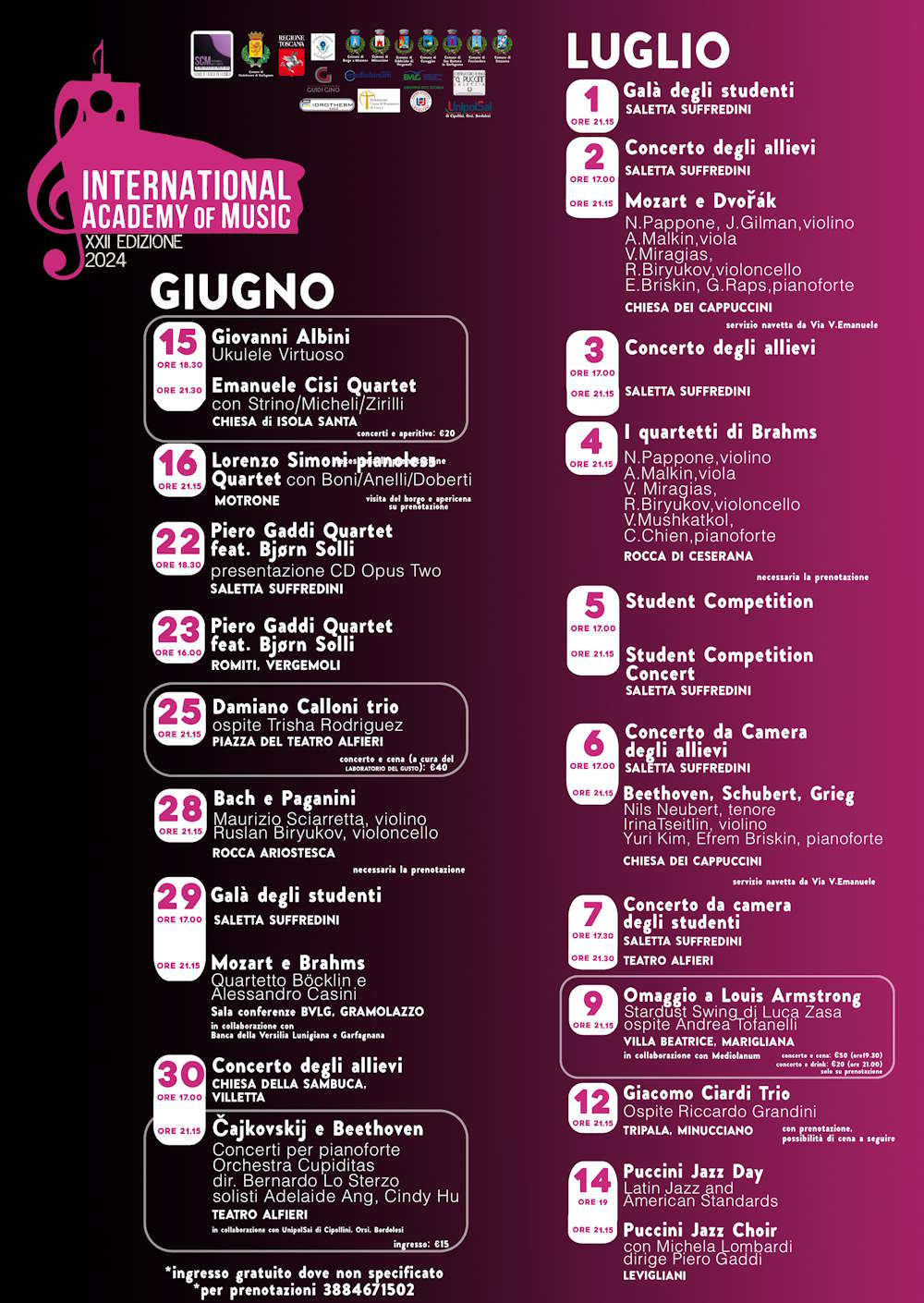 Torna dal 15 giugno al 14 luglio 2024 International Academy of Music Festival con concerti di musica classica e jazz in tutta la provincia di Lucca, tra Garfagnana, Mediavalle e Alta Versilia. Il festival, che da 22 edizioni porta un calendario ricco di musica per tutti, dal jazz italiano più raffinato alla musica classica internazionale, con artisti consolidati e nuove promesse da tutto il mondo, è nato da un progetto ambizioso della Scuola Civica di Musica in collaborazione con il Comune di Castelnuovo di Garfagnana. Il festival internazionale di musica classica e jazz “International Academy of Music”, nella sua sede Italiana, offre quest’anno 27 concerti, di cui 22 a ingresso libero.