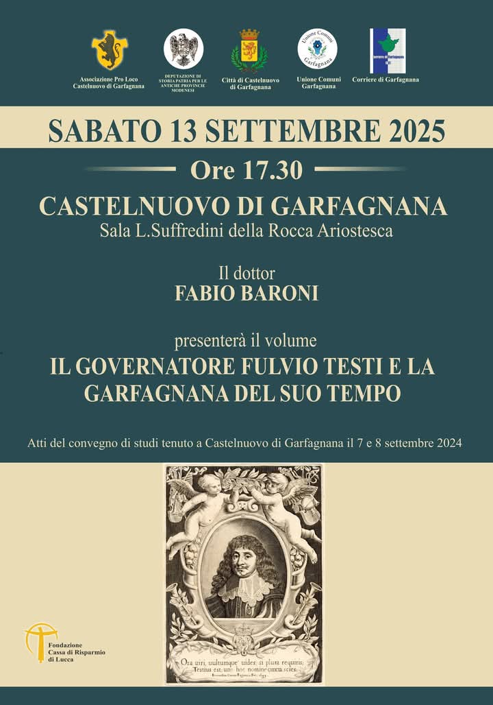 La presentazione del volume “IL GOVERNATORE FULVIO TESTI E LA GARFAGNANA DEL SUO TEMPO”, XVI volume della serie di studi storici sulla Garfagnana, si terrà presso la Sala Suffredini della Rocca Ariostesca alle 17.30