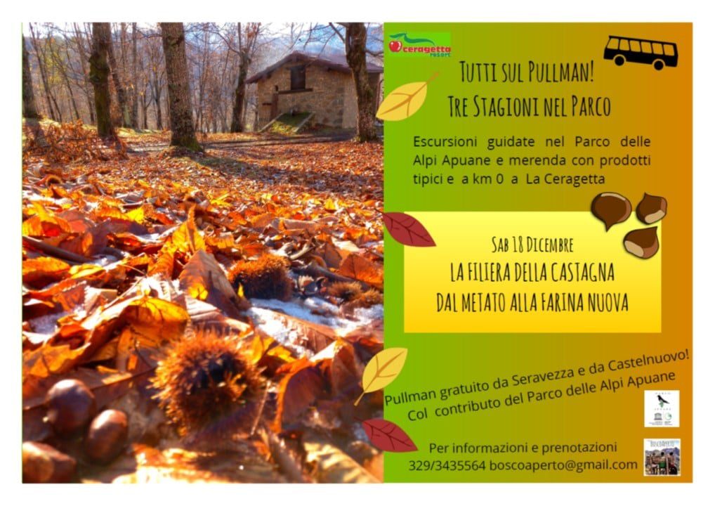 Escursione guidate con le guide del Parco Alpi Apuane nei castagneti di Careggine e visita a un metato, pranzo al sacco, nel pomeriggio merenda al Ristorante La Ceragetta per assaggiare la farina nuova e tanti altri prodotti a km 0.
