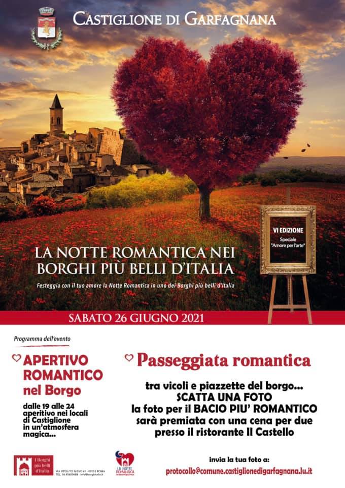 Scatta una foto e inviala a protocollo@comune.castiglionedigarfagnana.lu.it la foto per il BACIO PIU’ ROMANTICO sarà premiata con una cena per due presso il Ristorante Il Castello.