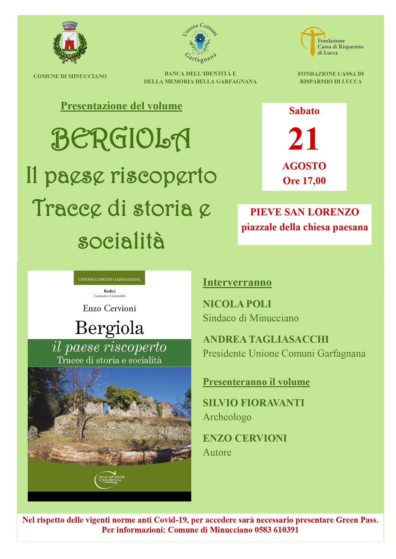 Alle ore 17.00 presso il piazzale della Chiesa si terrà la presentazione del libro “Bergiola, il paese riscoperto – Tracce di storia e socialità” di Enzo Cervioni.