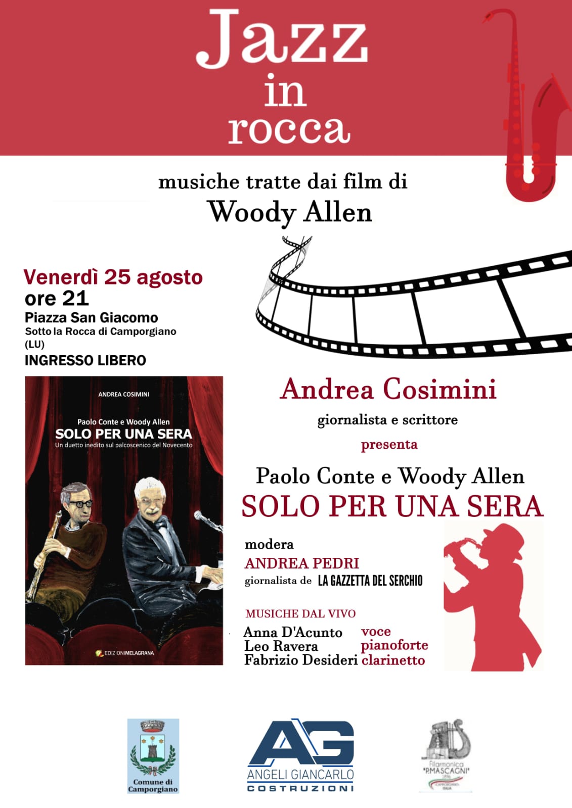 Alle ore 21.00 in Piazza San Giacomo si terrà la presentazione del libro di Andrea Cosimini “Solo per una sera, Paolo Conte e Woody Allen”