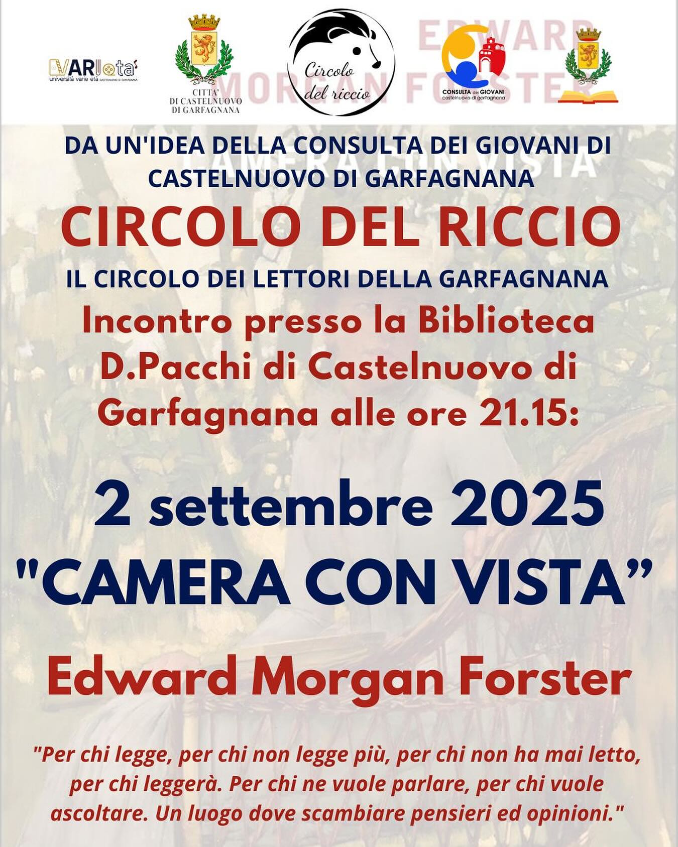 Questa sera si terrà si parla del libro “Camera con vista” di Edward Morgan Forster