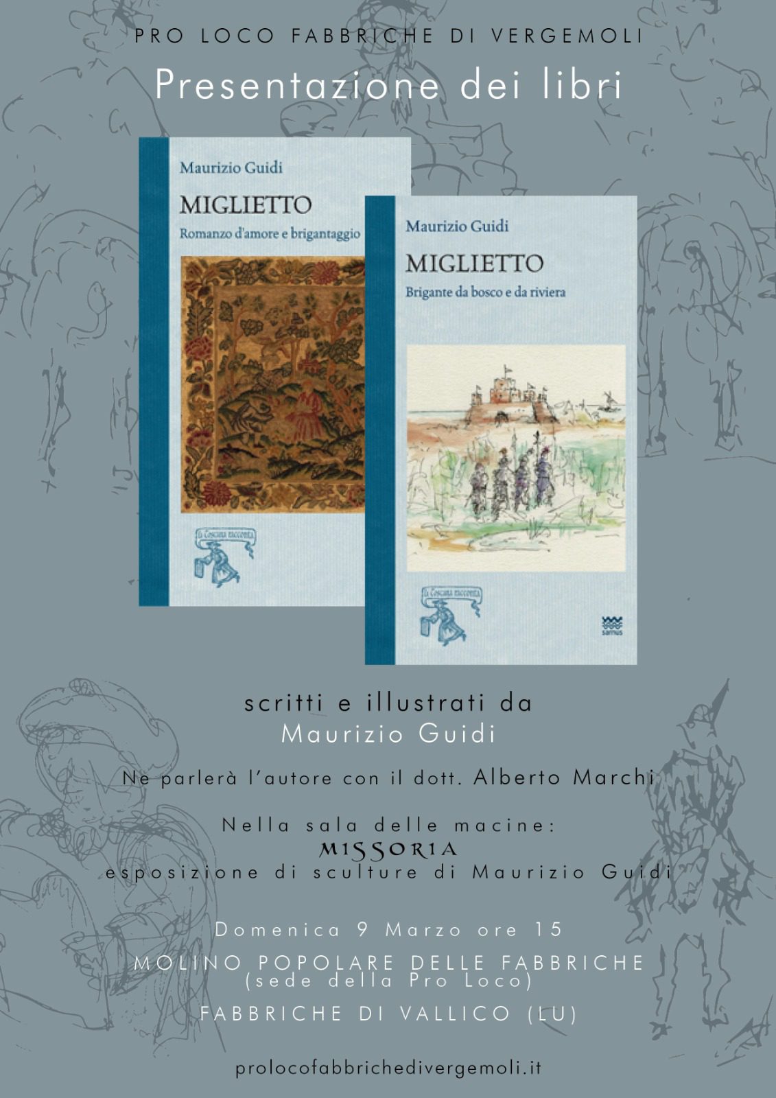 Alle ore 15.00 presso il molino popolare delle Fabbriche l’autore Maurizio Guidi presenta gli ultimi suoi due libri, scritti e illustrati da se stesso e in più ci accompagna all’esposizione delle sue sculture esposte nella sala macine del nostro antico molino.