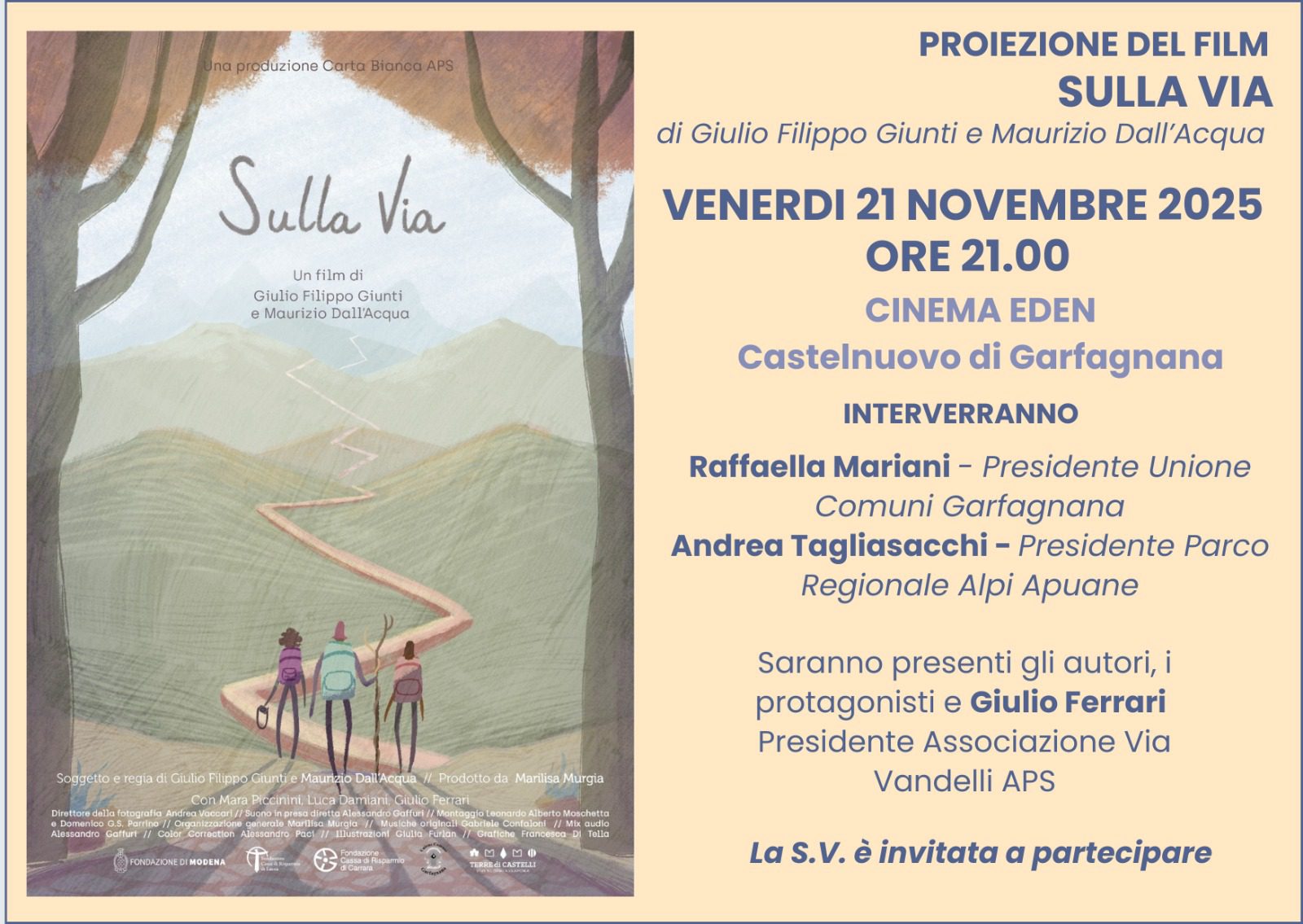 Al Cinema Eden di Castelnuovo di Garfagnana in prima visione per la Provincia di Lucca, verrà proiettato il film “Sulla Via” che racconta il cammino storico progettato dall’abate ingegnere Domenico Vandelli nella metà del ‘700 per collegare Modena con Massa.