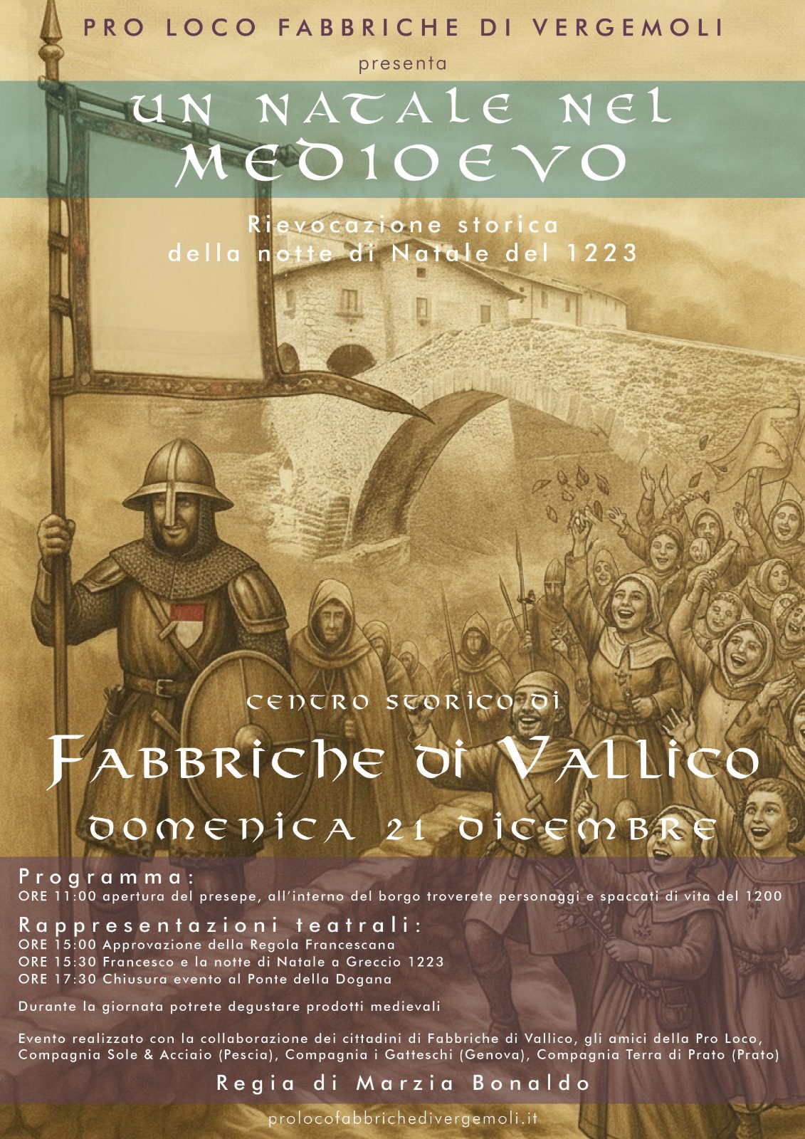 Home Eventi Un Natale nel MedioevoUn Natale nel MedioevoRievocazione storica della notte di Natale del 1223 Scarica la locandina + Aggiungi a Google Calendar + Esporta iCal Data21 Dic 2025 Expired! Ora ? Inizio Evento: 11.0 AM Fine Evento: 6.0 PM Luogo Fabbriche di VallicoFabbriche di Vergemoli Organizzatore Pro Loco Fabbriche di Vergemoli Telefono +39 3780689281 Email info@prolocofabbrichedivergemoli.it Sito web https://www.prolocofabbrichedivergemoli.it Condividi questo evento